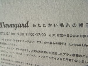 77NEEDLE WORKS さんのあたたかい毛糸の帽子展 のお知らせです